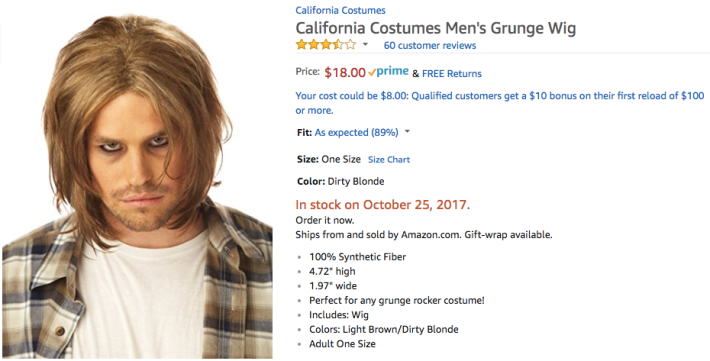CAN YOU TELL WHO IT IS SUPPOSED TO BE?: Oh, excuse me, I got ahead of myself. Yes, this is supposed to be Kurt Cobain. Though I think if you wore it without a flannel shirt and without telling people that “grunge” was in its Amazon description, people might just think it was a "The Rachel" Haircut wig, from Friends. Oh, maybe you can be the "The Rachel" Haircut next year!