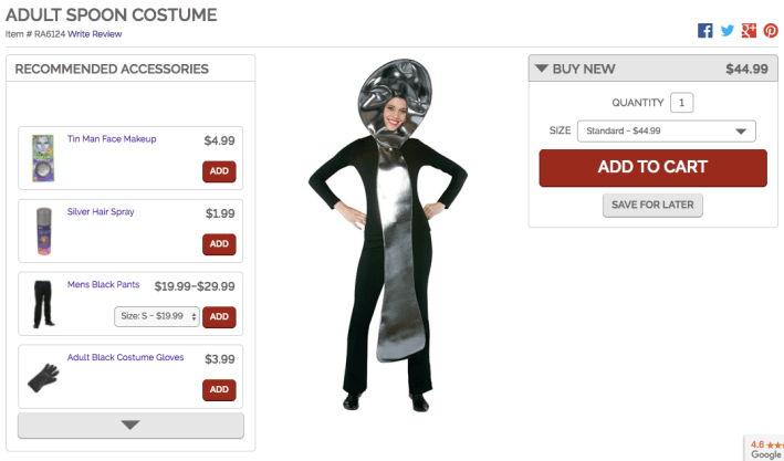 WHY IS IT SCARY?: Only being able to see the eye-nose-mouth part of a face is very classically scary. Also, guess what the word count is on the description of this costume. Did you guess? Okay, it is: 296 words! For a spoon costume? Not “scary,” exactly, but it is interesting. Here’s a quote: “Whether you're going to the national soup convention or you want to choose a costume that truly represents you this year, this spoon costume will not disappoint.”