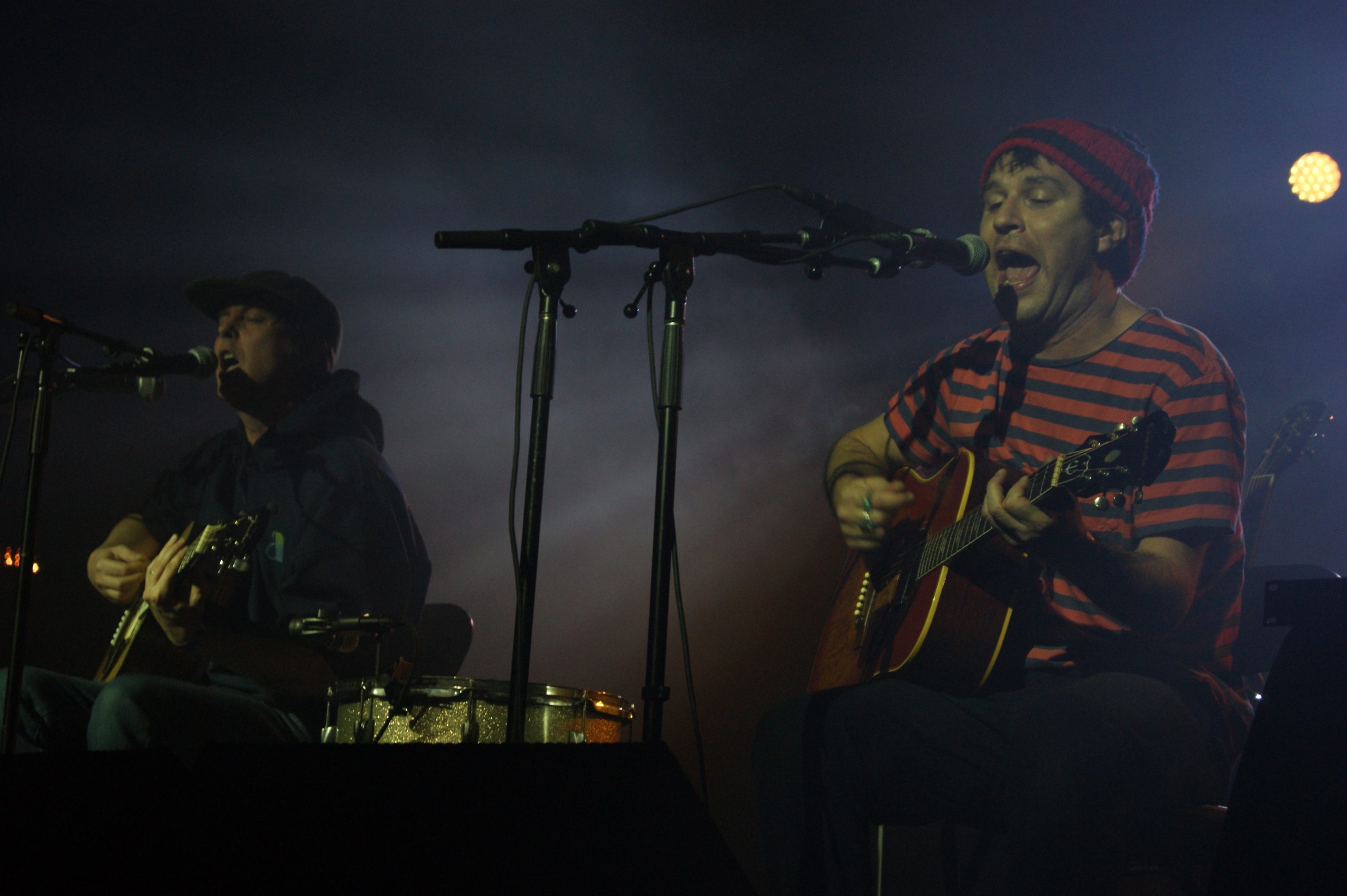 Two chairs were set up for Avey and Panda, the only members who play on the album. The mere sight of this brought on a frenzy of whoops and howls. Each chair had an acoustic guitar and two microphones, while a tom drum sat in between. Animal Collective’s stage arrangements are known to be extravagant — psychedelic visuals and mouth-shaped stages — but it only seemed appropriate that Sung Tongs’ stripped down ambience was met with an equally bare-bones setup. Avey and Panda finally emerged and the audience roared and hugged for a good minute. Avey wore a navy-and-peach striped shirt with a red-and-blue striped beanie, while Panda donned a hoodie and a five-panel hat. They looked about 20 years late for school picture day. I wondered if this was done on purpose, given the album’s childlike spirit. “Sung Tongs,” Avey said to more screams. They took to their guitars for “Leaf House,” a mesmerizing entrance into the sonic playground they built on the album.