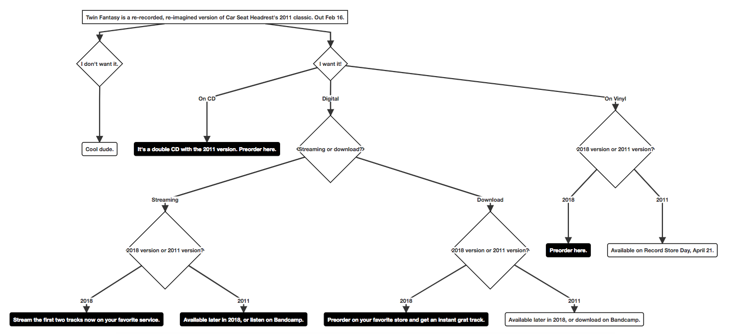 The new and allegedly improved Twin Fantasy is out 2/16 on Matador. Pre-order it here. Twin Fantasy: Mirror To Mirror -- a remastered version of the original 2011 album -- will be released 4/21 as a Record Store Day exclusive with the promise of wide re-release later in the year. Matador created this handy chart to help you decide which version to pre-order: