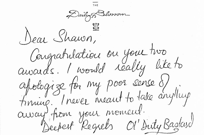 Colvin: But I wanna mention that I got flowers and a fax from ODB. I can't remember what flowers they were. But the card in the flowers said ... I think it said, "I'm sorry I took away from your moment."
