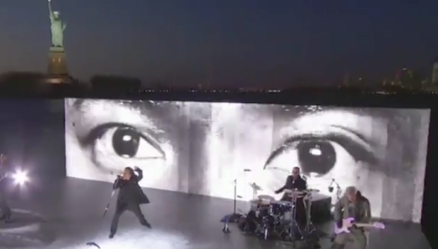U2's Bono and the Edge first appeared at tonight's Grammys awards as part of the Kendrick Lamar opening number, and they appeared later on in the night in a pre-taped segment to perform their Songs Of Experience team-up "Get Out Of Your Own Way." The band played on a barge in the middle of the Hudson River in front of the Statue Of Liberty, and were introduced by Camila Cabello, who talked about her experience being a Cuban-American. Towards the end of the song, Bono ad-libbed a reference to President Trump's recent racist comments, saying "Blessed are the shithole countries" into a megaphone, which was bleeped out of the live airing. Watch the performance below.