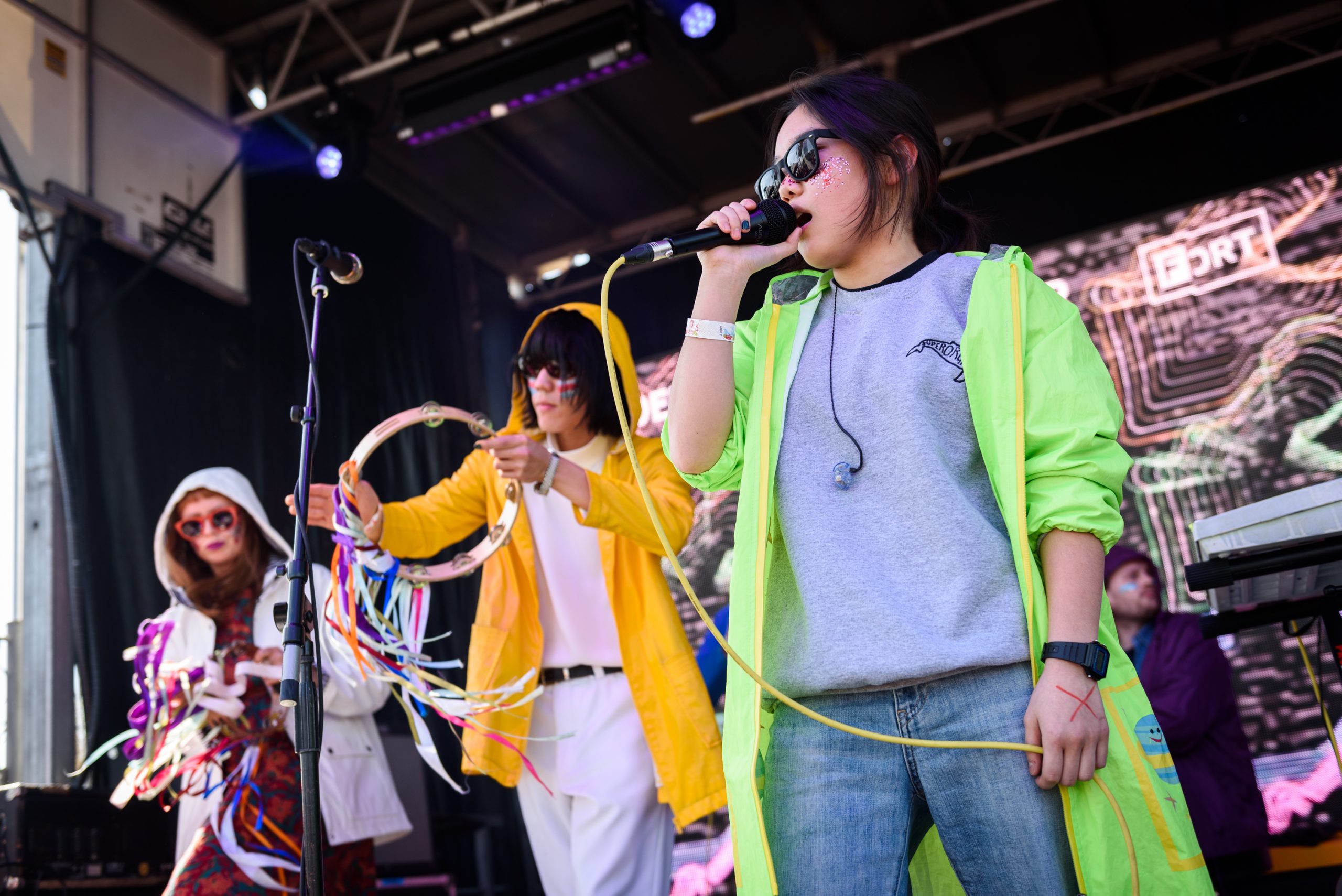 Superorganism take the stage in a cult-like procession. Most of them are wearing brightly colored rain jackets, hoods up. Their three back-up singers are holding bells, which they chime into their microphones as the band's intoxicating combination of rubber-band beats and squelching samples revs up behind them. Orono Noguchi, the group's 18-year-old lead singer, heads to the front of the stage, grabs her mic, and lets out a guttural scream, loud and long enough to startle everyone to attention in the FADER Fort field, where the UK-based pop collective are performing a midday set. Despite her small stature, Noguchi has a commanding stage presence, the sort where your eyes are constantly drawn to her. She's somehow insular and external at the same time, her musings on the mundanity of life mumbled out with an intensity that encourages you to hang on every word.