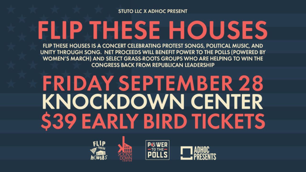 "President Donald Trump, the Trump administration, and 'Trump-ism' as defined by the President's words, tweets, and policies, is an existential threat to the nation and to Western democracy as a whole," Flip These Houses' Executive Producer Mike Stuto says. "This concert is a call to all citizens to vote for the opposition party in the November 2018 elections. (Democrats and Independents who caucus with Democrats), and to raise awareness and funds to help win our country back from those who will let its legacy be destroyed."