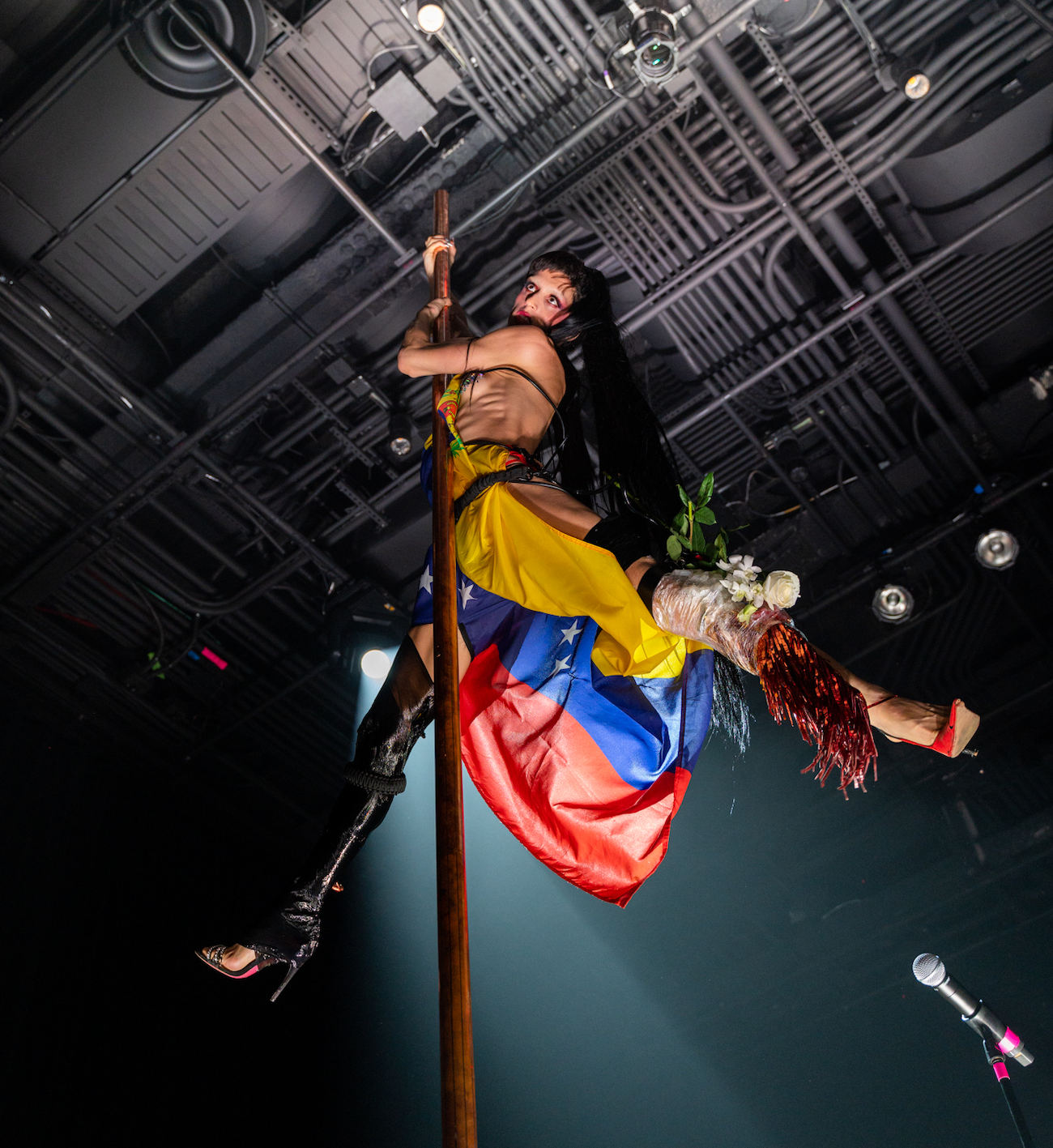 The shows took place at The Shed in New York City. Its Griffin Theater stage was adorned with Mars-like dirt, housing synthesizers, a baby grand piano, and a host of uncanny forms. A mass of black tendrils lay in the pit, another spread luxuriously across the piano. Each night, Arca reveled in this playground, scraped from the contours of her psyche. "This place is my dream come true," she gushed, draped in the Venezuelan flag, wig like a gothic Hatsune Miku. A mechanical bull, noise music-emitting stripper pole, and a cartoonish skeleton served as landmarks.