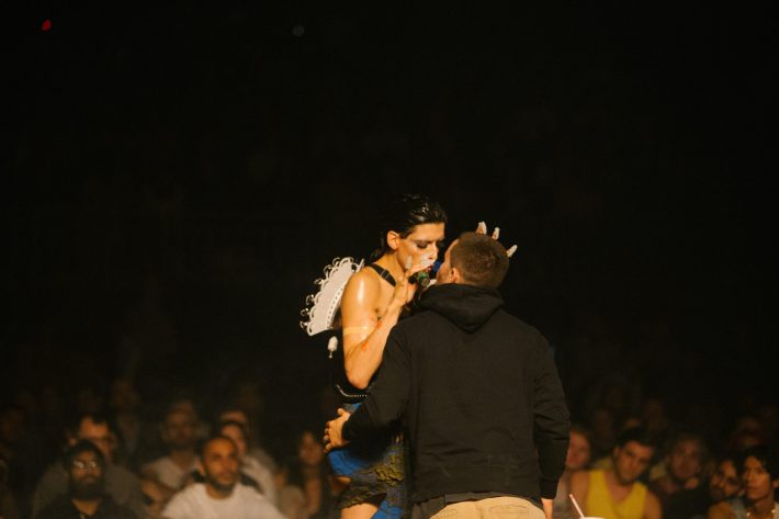 "Take the barriers down," she once requested, lying in the dirt. The next night, there were only retractable belt guards, like in an airport. The final night, nothing separated audience from stage except manners. Indeed, there was no fourth wall to be found during Mutant;Faith. Arca conversed with onlookers. "I've always wanted my own talk show," she admitted. She asked them about the last dream they had. This uncommon transparency was the residency's strongest pillar. The most interesting way this fluidity manifested was in Arca's communication with her crew.