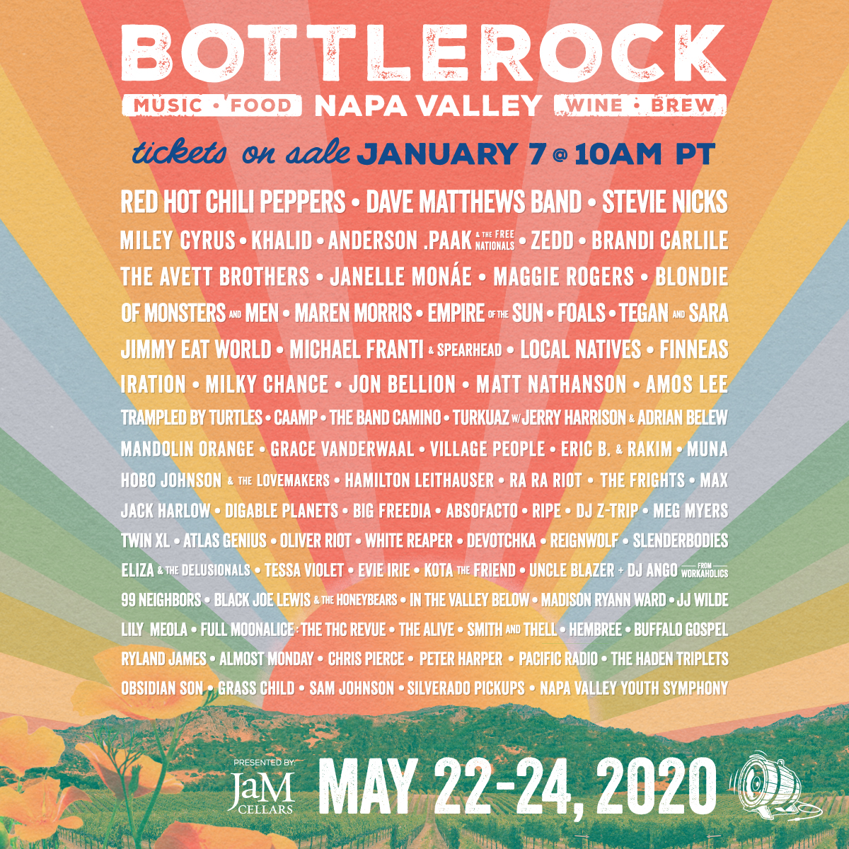 The Napa Valley-based festival Bottlerock has announced its 2020 lineup. Red Hot Chili Peppers, Dave Matthews Band, and Stevie Nicks are the headliners.