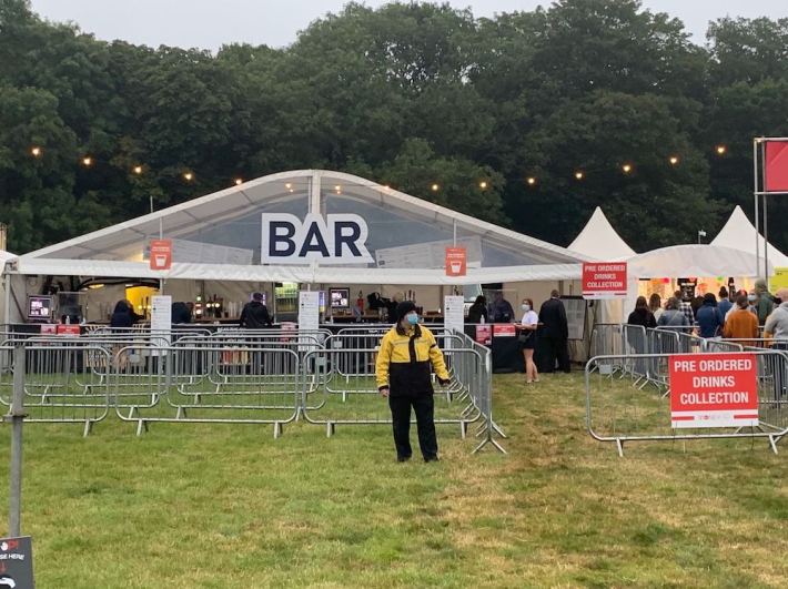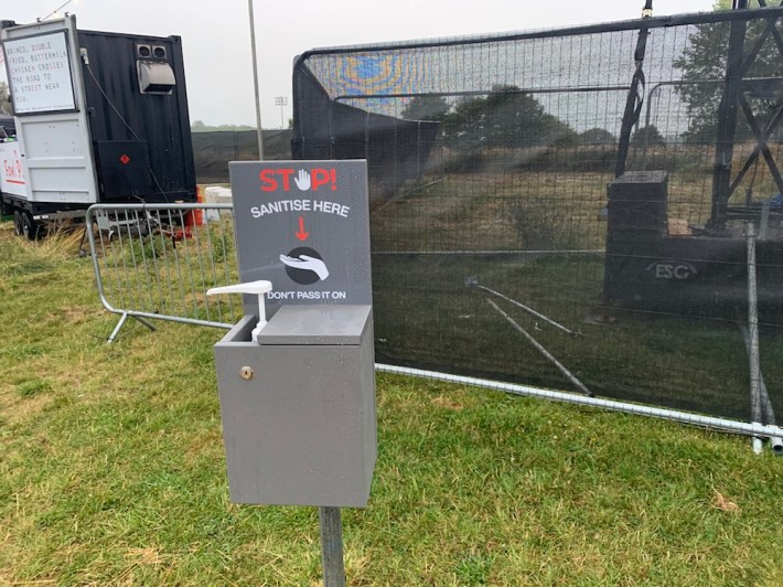 When you do get to your designated pen with your four friends, moving around the rest of the field feels pretty easy and smooth. Masks can be taken off when inside the pen, but need to be worn while roaming the one-way walkways that go in between the platforms and around the sides of the field. Fans could pre-order drinks ahead of the gig, and are also able to order directly to their pen via an app once in position. There’s also a regular bar, which one person per platform can visit at a time. When I visit to get a beer and then some fries from a food stall next door, it’s quiet and seamless, with masks all round and contactless payment. For stalls used to dealing with over 10 times as many customers, it never feels cramped or busy. Toilets come in the shape of portaloos, of which there are plenty, that are spaced out and never feel overwhelmed. The surrounding areas are drowning in hand sanitizer.