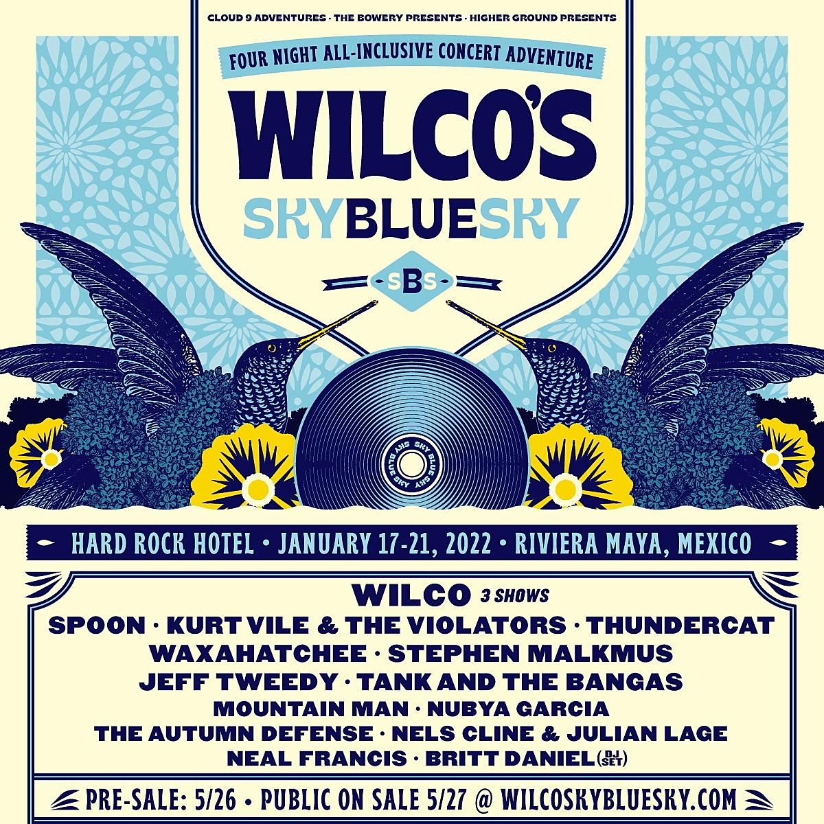 Sky Blue Sky, Wilco's festival/"destination concert experience" at the all-inclusive Hard Rock Hotel Riviera Maya resort in Mexico, is returning for its second edition in January 2022. "The inaugural Sky Blue Sky shattered our expectations and we can't wait to rekindle that experience with you all again," Jeff Tweedy says in a statement.