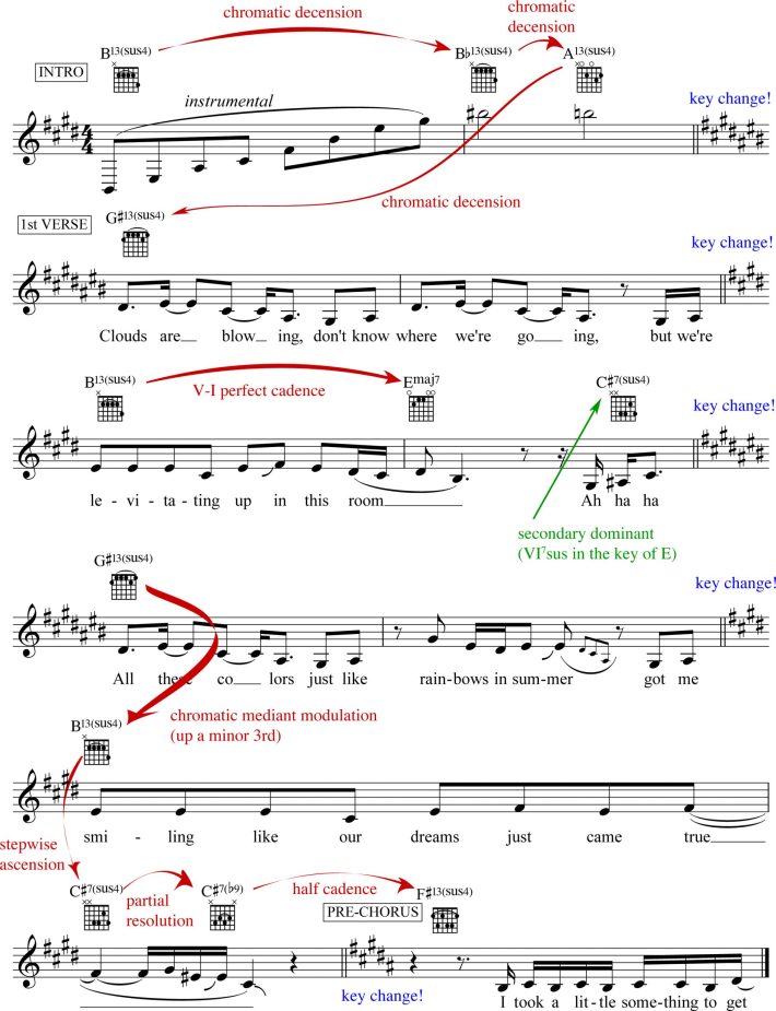 What follows next is the B13sus to EMaj7 cadence, which is the song’s only recurring instance of a traditional V-I resolution. It’s when Anderson .Paak finishes the line, “levitating up in this room,” and the release of tension feels both relieving and nourishing. But the respite is fleeting, as we’re quickly lifted back into suspension with the C#7sus pivot, returning us to G#13sus. In the transition from verse to pre-chorus, Mars and .Paak deploy a kind of “half cadence.” We hear the C#7sus resolve to the C#7, which craves resolution to F#Maj in a Bach-approved V7-I perfect cadence. But when the F# chord arrives, it comes in the form of ... you guessed it, an F#13sus, resulting once again in meandering, unresolved harmonic tension. This sus chord undergirds Bruno Mars’ line, “I took a little something to get here, yeah, yeah,” and I can imagine him singing that melody with a sly wink and nod, knowing he’s subverted expectations by sneaking in that deceptive cadence. Seriously, these guys know what they’re doing.