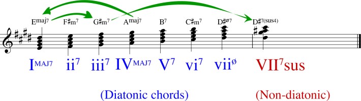 They begin with a repeating progression comprising the following changes: IVMAJ7 - IMAJ7 - iii7 - VII7sus. This passage is in the key of E, so we have:AMaj7 - EMaj7 - G#min7 - D#7sus. The D#7sus chord is the curious one.See Figure 6 below.