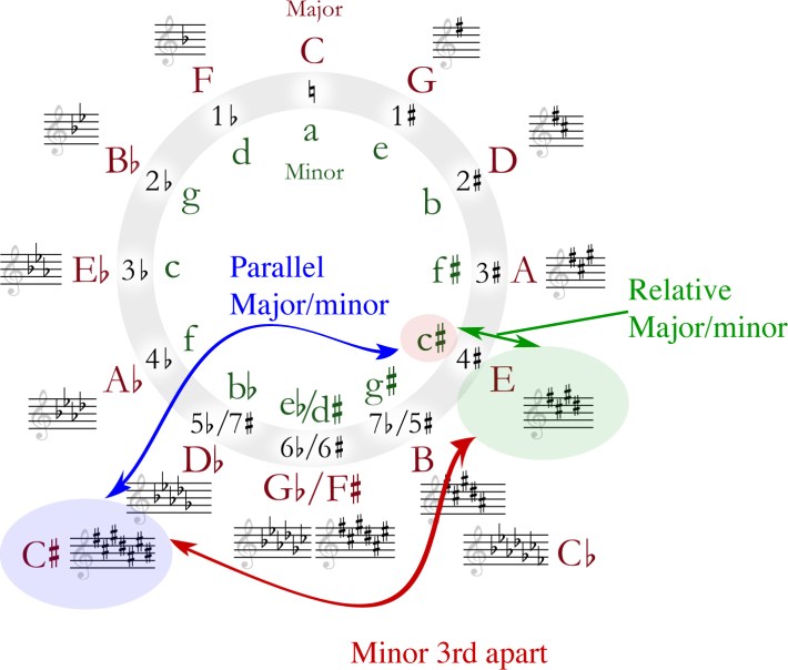 The G#13sus to B13sus motif creates a huge lift, and even though it’s a recurring theme, it feels unexpected every time it happens. This is because the modulation has the effect of a minor 3rd key transposition, which is one type of “chromatic mediant” modulation.(For more on this, see the In Theory article on Nirvana’s “In Bloom.”) Changing key centers upwards by the distance of a minor 3rd sounds so dramatic because it’s akin to shifting the axis of the song from a Major key to its parallel minor key.For example, going from C# Major to E Major feels like going from C# Major to C# minor (because E Major and C# minor share the same key signature, as the latter is the “relative minor” of the former). See Figure 3, below. While the key centers of C# Major and E Major share some common tones, the really crucial ones (the 1st, 4th, and 5th scale degrees) are different -- and this is what makes the shift so effective.(For more detailed background on this, see the In Theory article on Lorde’s “Solar Power.”)