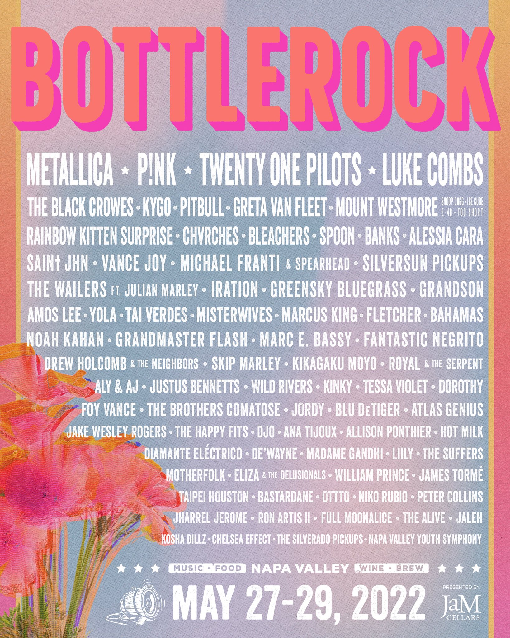 The Napa Valley-based festival BottleRock has announced its 2022 lineup. Metallica, Pink, Twenty One Pilots, and Luke Combs all on the first line of the poster; the rest of the roster includes the Black Crowes, Kygo, Pitbull, Greta Van Fleet, the hip-hop supergroup Mount Westmore, Chvrches, Bleachers, Spoon, Banks, Alessia Cara, and some more.