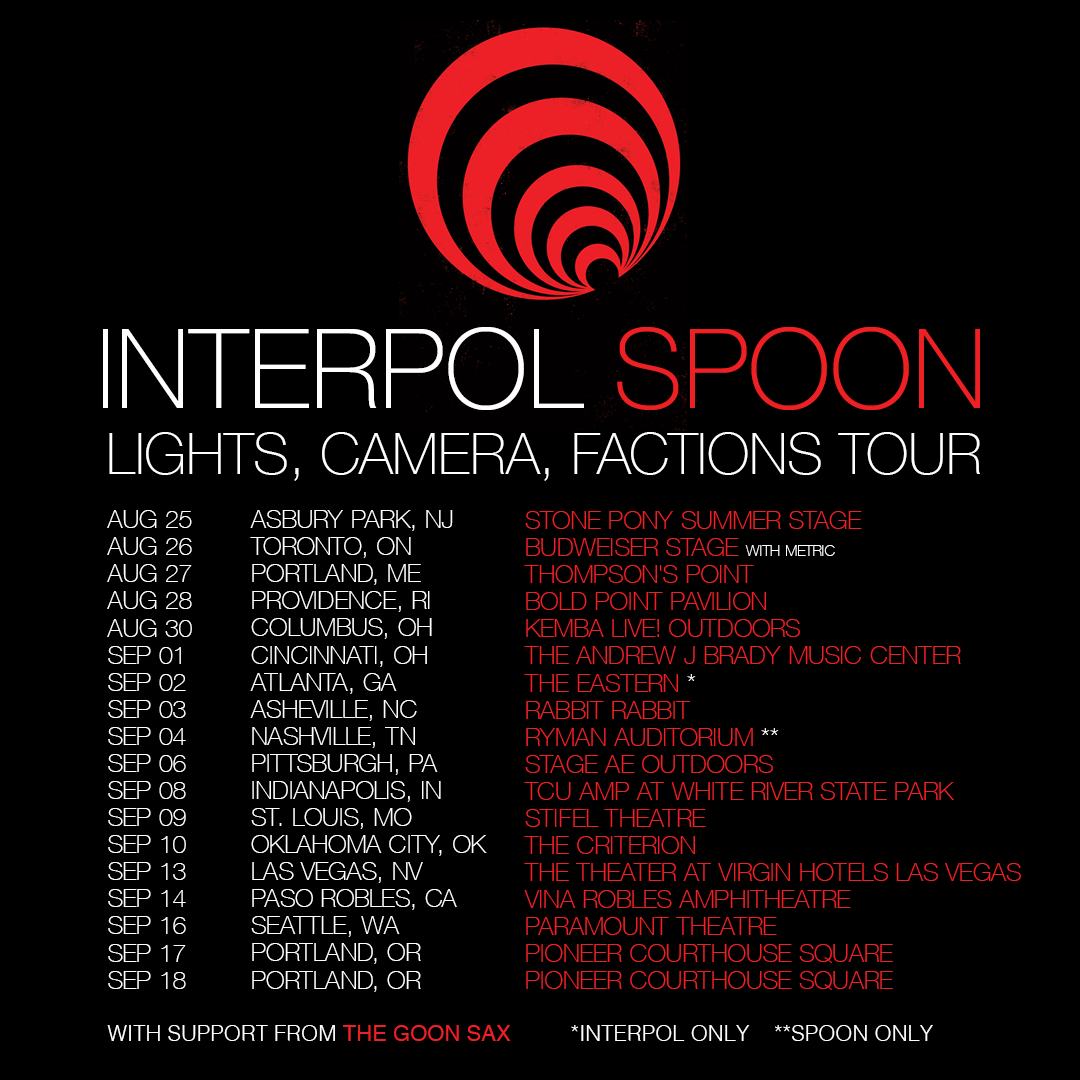 Interpol and Spoon are hitting the road together later this year. The bands just announced what they're calling the Lights, Camera, Factions tour. The bands have just announced what they're calling the Lights, Camera, Factions tour -- it will kick off in Asbury Park, NJ in August and bring them across the US before wrapping up a few weeks later in Portland, OR. Fellow Matador signees the Goon Sax will be opening on most of those dates.