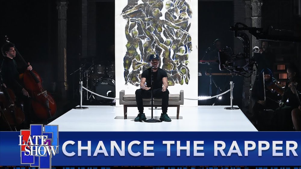 On last night's Late Show, Chance, who is still wearing the 3 hat, performed "Child Of God" while sitting in front of the Naïla Opiangah painting from the single's cover art. The stage set was made up to look a bit like a museum, with Chance rapping on a raised platform with string musicians off to either side of it and with the lyrics flashing on the screen. Moses Sumney did not take part in the performance, but Naïla Opiangah joined Chance onstage at the end. The whole thing has a real Def Poetry Jam vibe, but that's nothing new for Chance. Chance isn't really trying to switch his style up, and he still knows how to perform on TV.