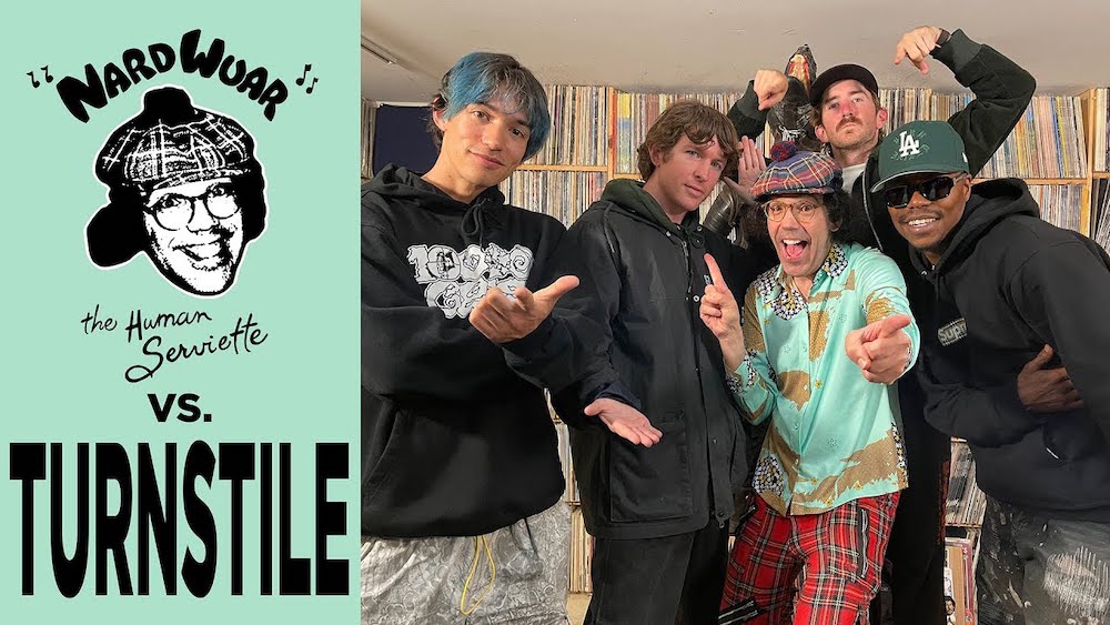 Turnstile have officially taken a turn about the record store with Nardwuar. Visiting the Canadian interviewer at Neptoon Records in Vancouver, the band are currently on their North American tour in support of 2021's Glow On. Frontman Brendan Yates exchange framed photos -- the same photo! -- of the first time they all met at SXSW in 2016. Turnstile were trying to get into a Sheer Mag show, and Nardwuar had just come from seeing Downtown Boys. Then, Nardwuar keeps up with tradition by giving each band member gifts. Bassist Franz Lyons gets a bobblehead of Bad Brains frontman HR, and Yates gets a vinyl soundtrack to the 1986 thriller Good To Go. Watch the interview below.