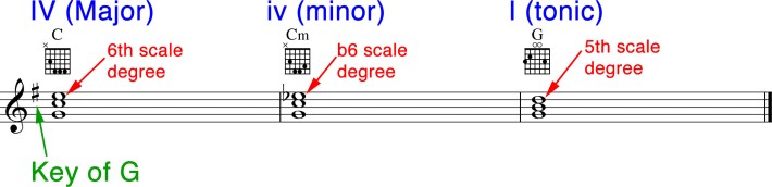 A variation of the IV-to-I plagal cadence is the "minor plagal cadence," which engages the minor iv chord to resolve to the I chord. One particularly poignant way to execute this maneuver is with a IV-iv-I resolution (i.e., Major IV to minor iv to I).See Figure 1 below.