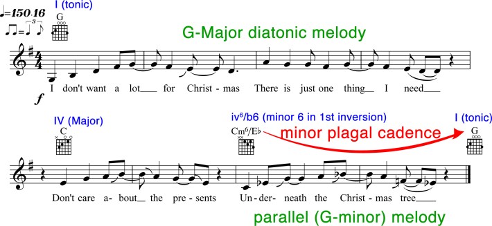 The movement from the notes E to E♭ to D creates a chromatic line for smooth voice leading, as lowering the 6th scale degree to the ♭6 brings it closer to the 5th scale degree resolution note through a process called "chromatic intensification," imbuing it with a stronger sense of pull. Notably, this cadence provides an example of what we call "modal interchange," where we borrow a chord from the parallel minor scale: C minor is the "iv" chord in the key of G minor. Songwriters of the Tin Pan Alley era used this cadence regularly to summon a wistful feeling, as the bittersweet ♭6 scale degree yearns to resolve down to the comforting 5th scale degree.(Irving Berlin's 1942 classic "White Christmas" is a fitting example.)Decades — perhaps centuries — of hearing this harmonic movement have trained us as listeners to experience this sound as "sentimental" — and it is precisely this characteristic that "All I Want For Christmas Is You" exploits to invoke the feeling of nostalgia. See Figure 2 below.
