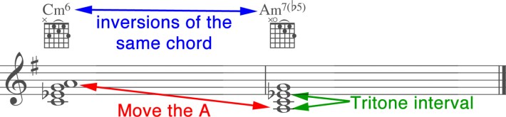 With most four-note chords, if you were to alter the order of how the notes are stacked vertically from top to bottom, you might find that it doesn't affect the musical outcome that much. But this isn't so with the min6 and min7(♭5) inversions.What's so alluring about these four-note chords is that they can take on a different emotional meaning based on how they're voiced and depending on what chord comes next. Listen to the jazz standard "Autumn Leaves" — and pay attention to the line "but I miss you most of all, my darling." The Emin7(♭5) functions as a substitute for the ii chord in a quasi ii-V-i cadence, producing a divinely aching or longing feeling. You'll find similar — as well as divergent — dramatic effects in jazz standards like "Stella By Starlight," with the results varying depending on the harmonic motion preceding and following each min7(♭5) chord.5