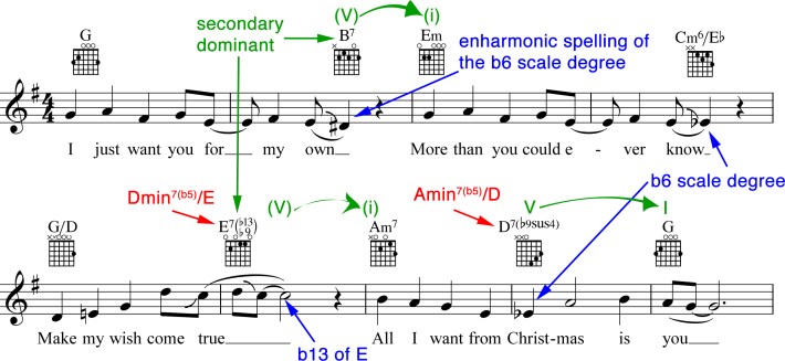 Unsurprisingly, the prechorus/chorus section of "All I Want For Christmas Is You" is where things really heat up. Mariah Carey's melody features nice use of chromaticism and elegant intervallic jumps. The harmony uses a secondary dominant chord and cleverly disguised min7(♭5) chords to fashion cascading V-I (and V-i) authentic cadences. See Figure 4 below.