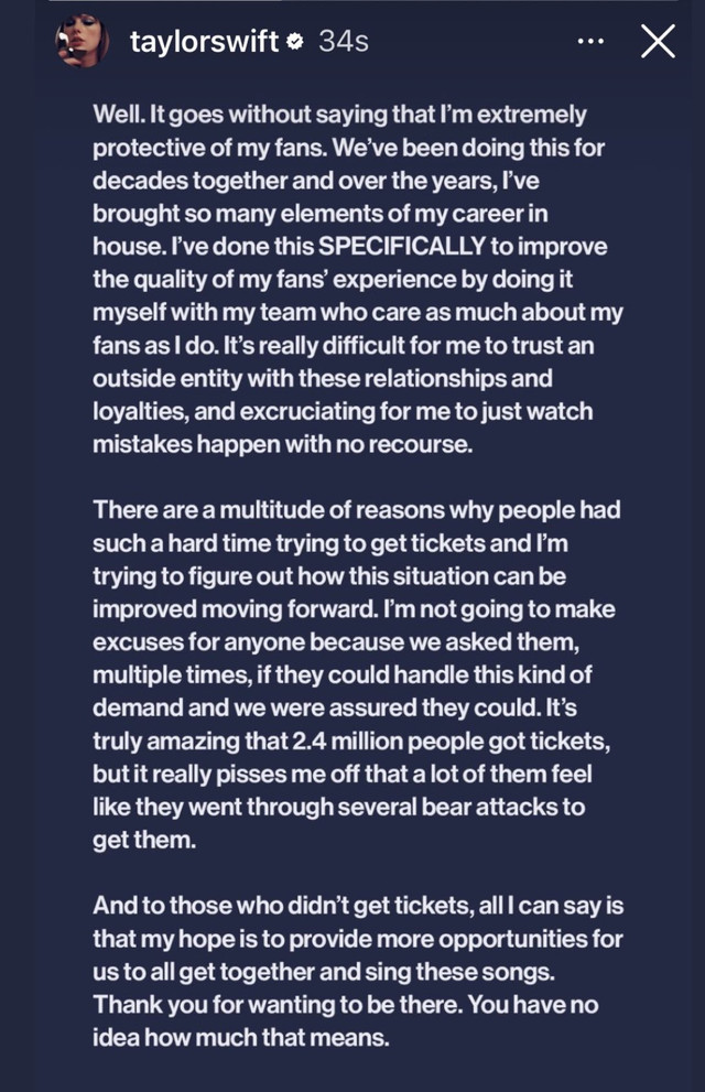 Ah yes, the "verified fan presale," where "verified fans" get early access to concert tickets. But what does it mean to be a "verified fan"? Precisely nothing. It means that you gave Ticketmaster your email address and waited at your computer along with thousands of other people. Ticketmaster has been pulling this shtick for years with popular artists' concerts, but this year, the "verified fans" got angry. They complained about being lured into an elaborate maze of waiting rooms and queues to obtain Bruce Springsteen and Paramore tickets, only to find no seats left for them. But it was the Taylor Swift presale that sparked the loudest outrage. Not only was it impossible for many to score tickets during the mad dash, the demand was too high and left too few spots for the public sale. You know, the post-presale sale. Some chalk it up to Ticketmaster "verifying" bots and ticket-flippers, who bought seats in bulk. Others theorize poor planning and shoddy capacity calculations. Swift made her disapproval clear with a statement on Instagram, apologizing for fans suffering the equivalent of "several bear attacks" to get their hands on tickets. Of course, this solved nothing. The bears won. There's got to be a better way, and it can't be a pre-presale!