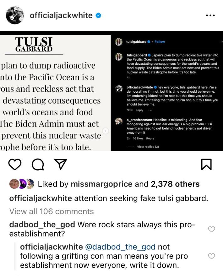A couple weeks ago, Jack White called out a bunch of celebrities for hanging out with Donald Trump at a UFC Fight, which got the conservative grifters in a tizzy. Among them is Tulsi Gabbard, the former Hawaii representative who left the Democratic Party last year and has since settled into her position as a Fox News talking head and stoker of online outrage.