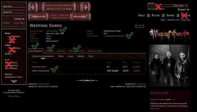 Players can navigate to objectives by clicking the tabs and internal links on a band's Encyclopaedia Metallum page. Internal links are links that point to other pages on Encyclopaedia Metallum. Players can't leave Encyclopaedia Metallum to complete objectives. Links on album, artist, band, country, and label pages are fair game. Internal links found under tabs are also fair game. However, links and functions found in the surrounding static frames are off-limits. Players can't use the "Search" bar. They can't use "Advanced Search." They can't use the "Bands" or "Labels" menu. They can't access the "Forum."