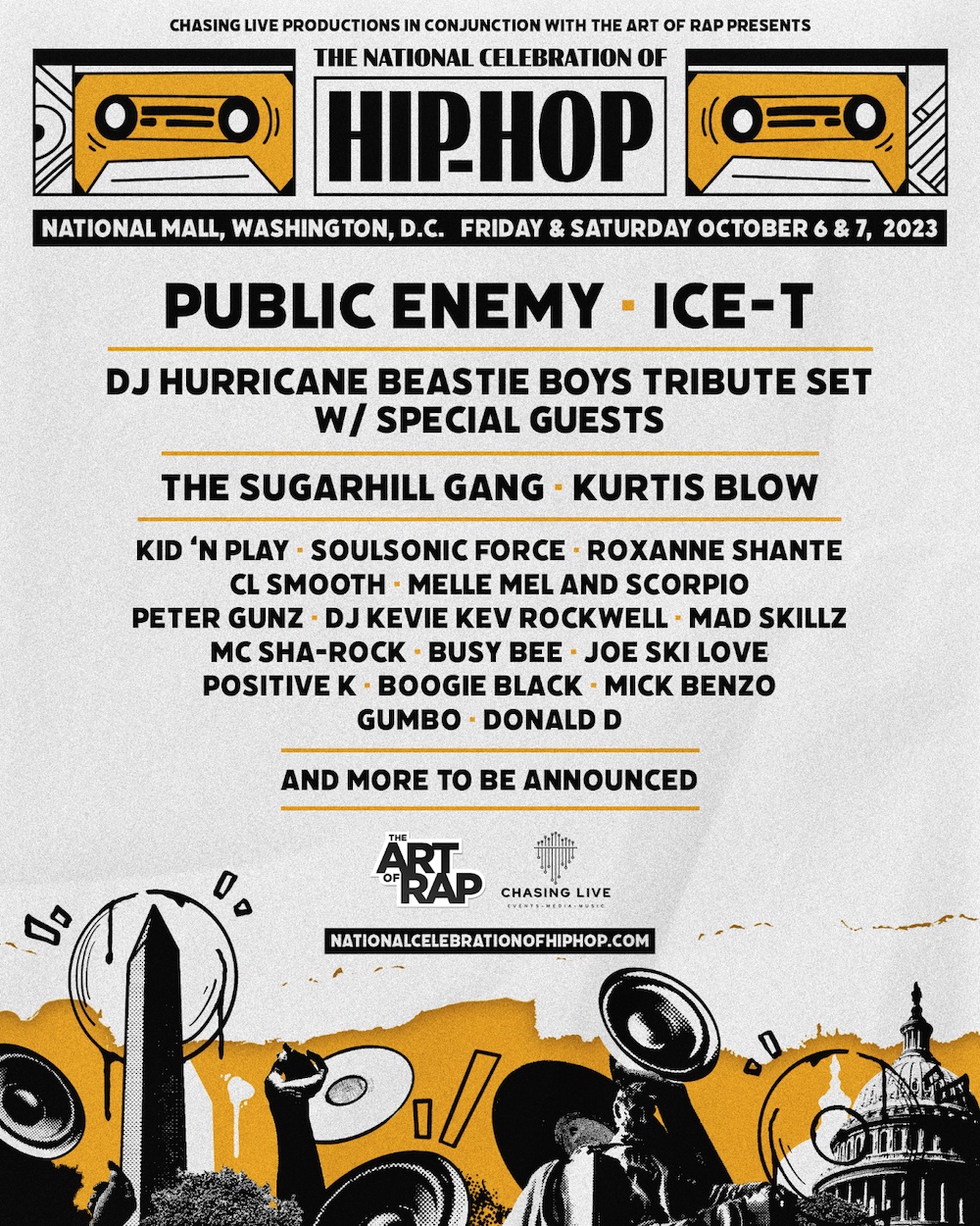 The celebration for hip-hop's 50th anniversary has spawned shows across the country, the most recent taking place at Yankee Stadium earlier this month. In October, another concert will take place in Washington, DC on the National Mall. Billed as "The National Celebration Of Hip Hop," the event will feature Public Enemy, Ice-T, a Beastie Boys tribute set by DJ Hurricane with special guests, the Sugarhill Gang, Kurtis Blow, and many more.
