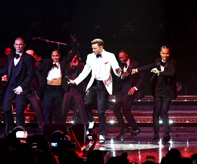 Timberlake sang "Cry Me A River" immediately after his Jay-Z collab "Holy Grail," which he did without Jay-Z. On that song's hook, Timberlake interpolates Nirvana's "Smells Like Teen Spirit," and I guess he tried to carry that hook through into "Cry Me A River." As the song started, Timberlake said, "No disrespect." Then he started singing: "And we all just entertainers/ And we're stupid and contagious."