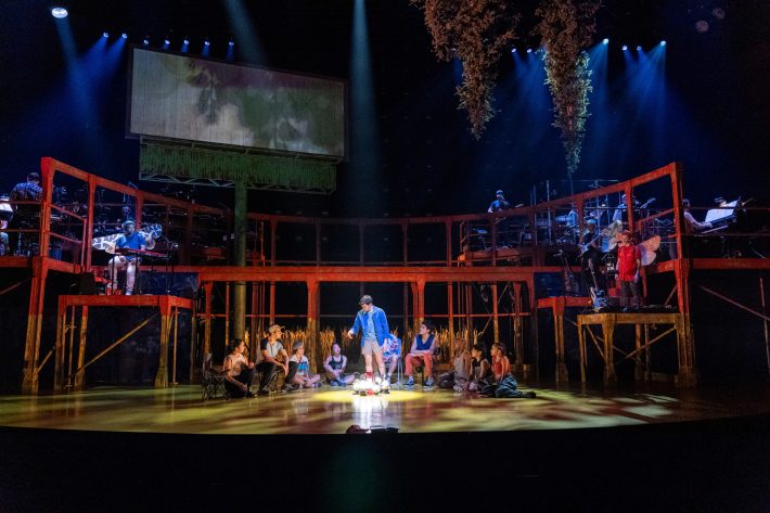 However you categorize it, Illinoise is (at least) not a typical musical, in which the same company of performers handles the dancing, singing, and acting. Instead of a script, Drury reordered the album into a story told entirely through Stevens' song lyrics — really a series of stories told around the fire, before a central narrative emerges later in the show. (An extensive diary within the official program works as supplemental material.) The music, arranged by pianist Timo Andres, is performed by a band perched above the stage, with spruce trees hanging overhead. Three voices — Elijah Lyons, Shara Nova, and Tasha Viets-VanLear — handle Stevens' lyrics and vocal flourishes wonderfully, singing with soft grief in quiet moments like "Casimir Pulaski Day" and with verve on the bittersweet yet hopeful "Chicago."