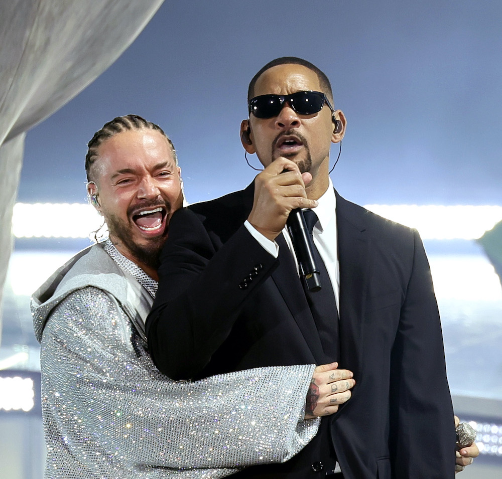 J Balvin played Coachella's main stage just before last night's headliner Doja Cat, who had a few surprise guests of her own. Near the end of his set, Balvin dedicated a giant production to "Men In Black," the theme song from Will Smith's 1997 blockbuster. It was the first single that Smith ever released under his own name, after years as half of DJ Jazzy Jeff & The Fresh Prince, and it seems like Smith hadn't performed that song in at least 20 years before last night. Smith didn't just pop up onstage and rap the song. He wore full costume, and the stage had a giant alien head and dancers dressed up as aliens and MIBs. At the end of the performance, Smith and Balvin did the dance steps from the video, and then Smith flashed the audience with one of those memory-eraser rays.