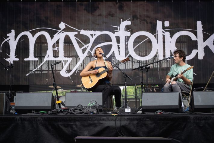 I catch part of Miya Folick's performance. She plays an open-tuned acoustic guitar next to an electric guitarist providing backing vocals, both of them seated in chairs on the stage. Once again, the breezy part of the day is giving way to sun. Folick polls the audience to see if she should take off her sweater: "It's like my security blanket, I wear it all day long, I wear it to bed. I'm the kind of person who sleeps fully clothed." The songs are very pretty, and I make a note to look up her music when I get home.