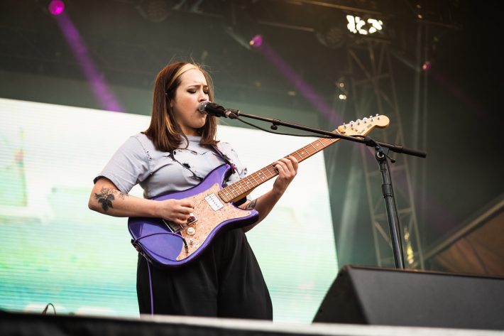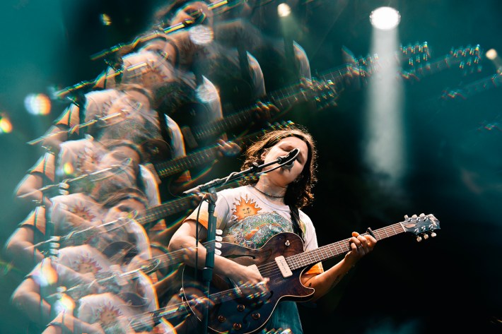 I bum another cig near the port-a-potties and ask the two people I'm standing with who they're most excited to see. Soccer Mommy, who's up next, is the first name from both of them. They've got a large and enthusiastic crowd. They're playing as a five-piece with three guitars, one of them a twelve string, and most of the band is wearing sunglasses. Soccer Mommy have spent the last several years becoming a fully evolved, surgically precise version of themselves. I saw an early iteration of the band in 2018 open for Stephen Malkmus And The Jicks at the Star Theater. Sophie Allison had X's on her hands and spent the evening chain smoking by the merch table. She was really nice. That show had almost nothing in common with this one, however: It's clear that they're fully comfortable being a big room band now, and they sound calm and confident.