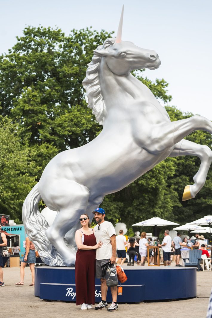 The festival is laid out almost exactly like it was in 2017. The north and south ends of the park are anchored by two basically identical stages: the Unicorn Stage and the Captain Pabst Stage, respectively. In between, the west side is lined with food trucks and a handful of retailers, while the east side along the Willamette River is taken up primarily by two port-a-potty pods, an indoor and an outdoor bar, and the medical tent. A 10- or 12-foot unicorn statue sits in the exact center of the field, which serves as a photo opp for people as they come through the gates.