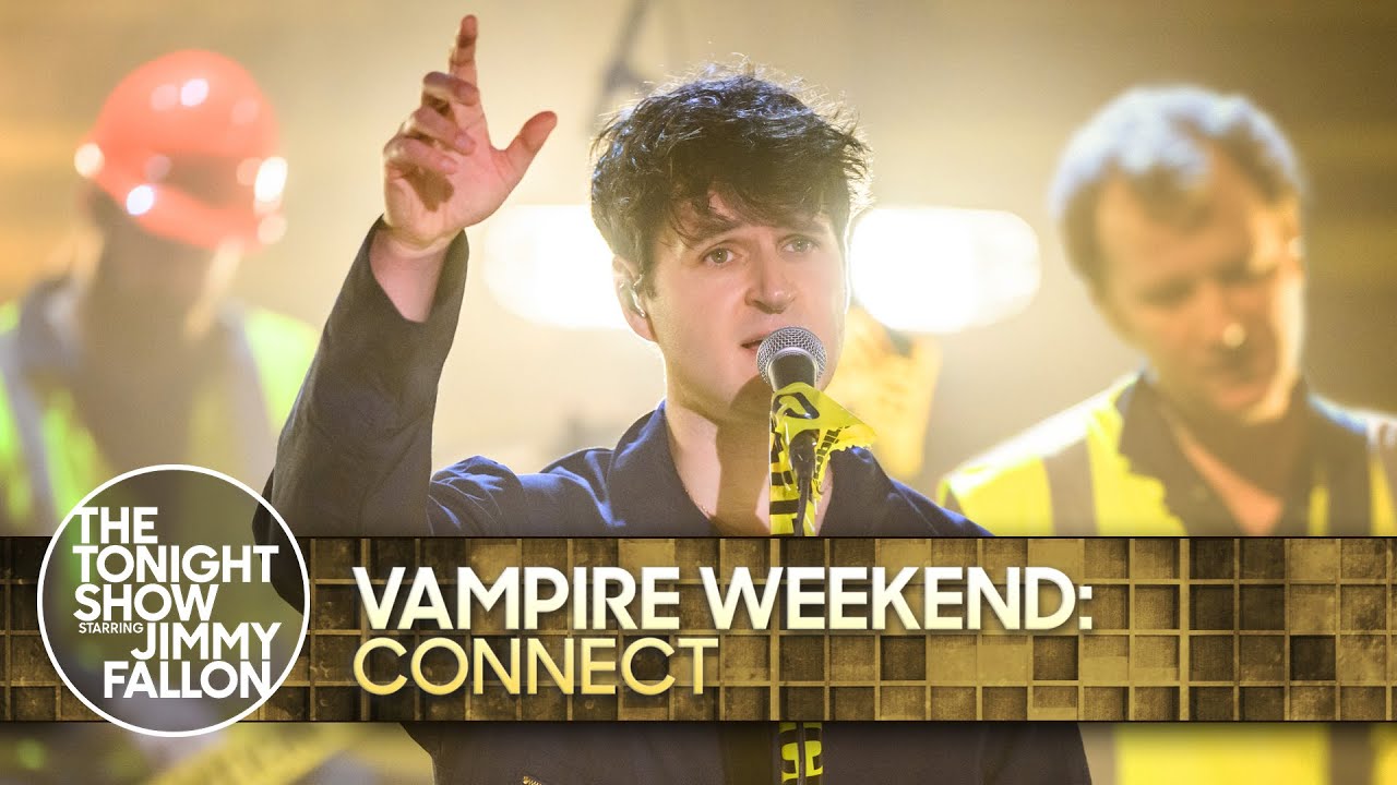 Vampire Weekend are currently on a very eventful tour supporting their recent album Only God Was Above Us. They were also the musical guest on Fallon Monday night, where they performed album highlight "Connect." The stage and gear were wrapped up in caution tape, the band members wore neon safety vests and hard hats, and Ezra Koenig did a vibraphone solo.
