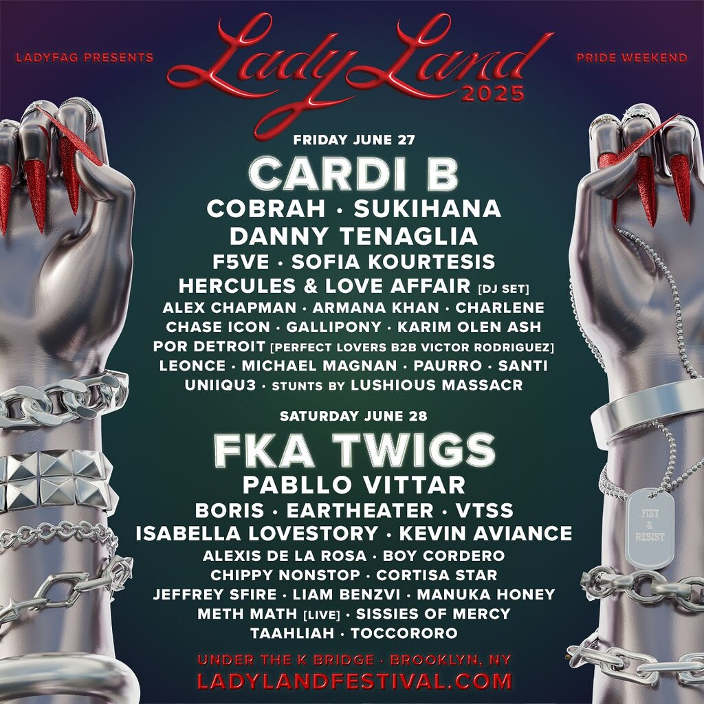 LadyLand is returning to New York this Pride Month. The two-day fest is going down at Under The K Bridge Park in Greenpoint, Brooklyn on June 27 and 28, with headliners Cardi B and FKA twigs. The rest of the weekend will feature a pretty eclectic array of performances from electronic experimentalist Eartheater, Brazilian avant-pop singer Pabllo Vitar, Berlin-based DJ Sofia Kourtesis, a DJ called Boris who's not to be confused with Boris the band, and more. See the full lineup below, and you can sign up for pre-sale ticket access here. (Hopefully twigs gets her visa issues sorted in time.)