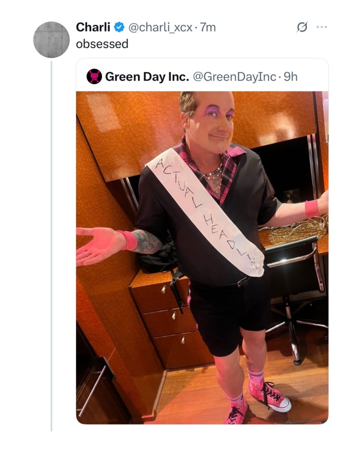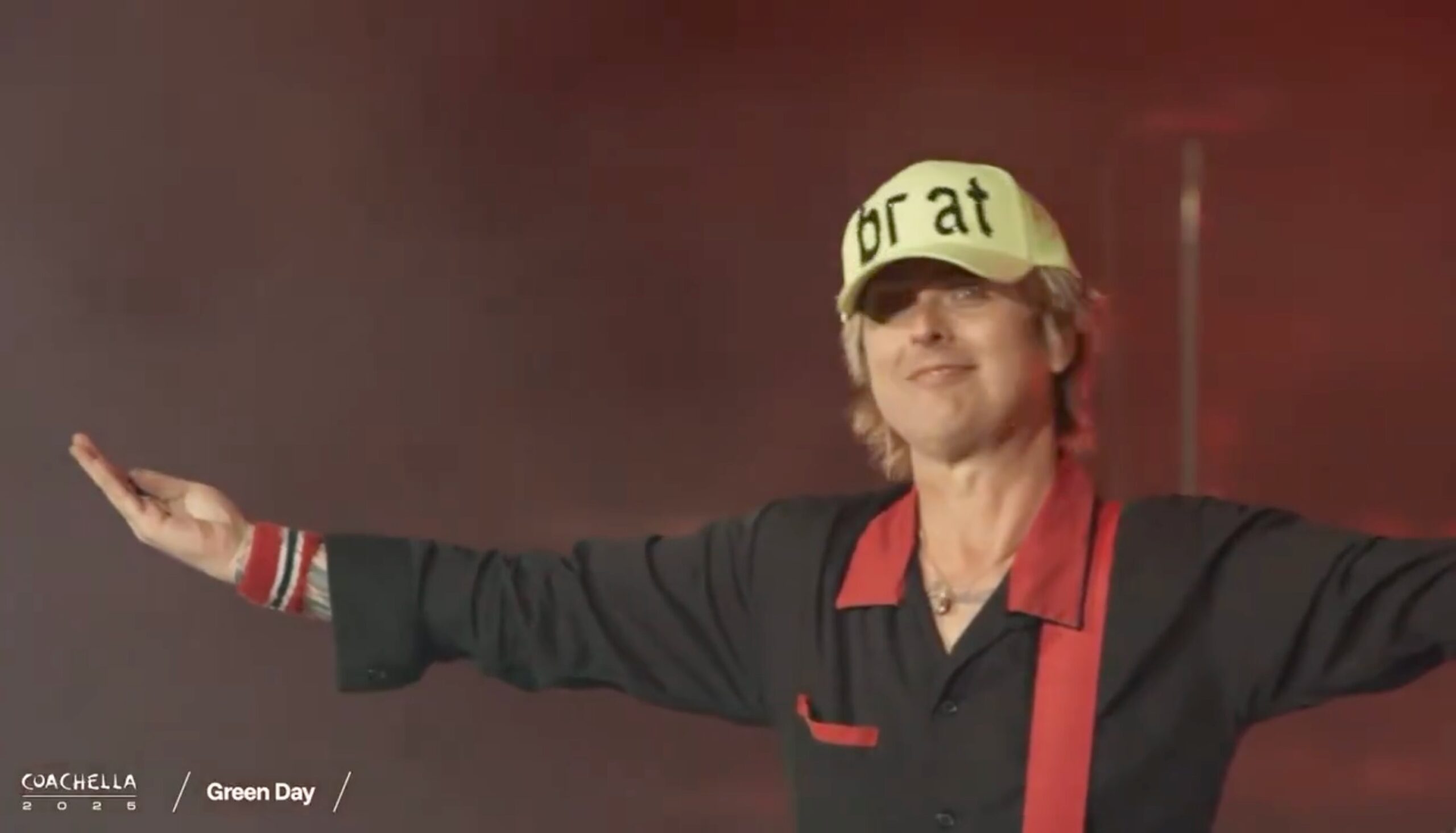 After she played Coachella last weekend, Charli XCX went to an afterparty wearing a pageant sash that said "Miss Should Be Headliner." Although she'll headline various European festivals this summer, at Coachella Charli's set time was a few hours before actual headliners Green Day. When a photo of that sash began circulating online, some people got pissed over the implication that Charli might think she's a better artist than Green Day. Green Day are better at taking a joke than those people are. They proved as much at their Weekend 2 Coachella set, during which Billie Joe Armstrong happily took an audience member's neon green Brat cap and wore it himself. (Incidentally, Green Day have a song titled “Brat” on their 1995 album Insomniac, but they didn’t play it last night.)