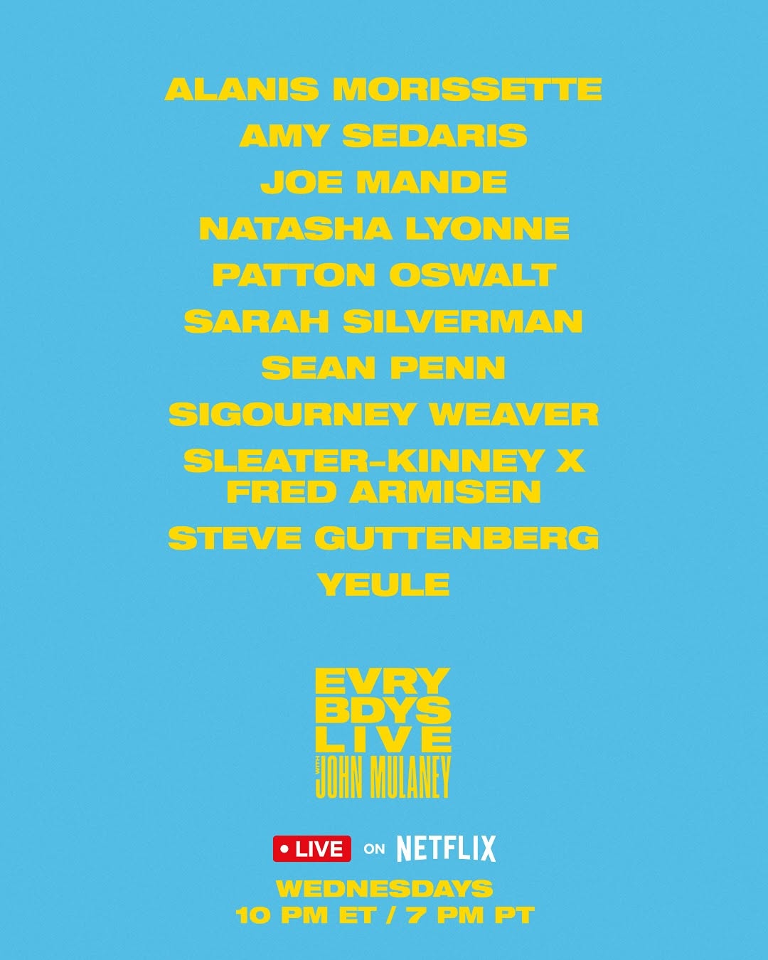The inaugural season of John Mulaney's no-holds-barred Netflix series Everybody's Live has played host to some genuinely awesome musical guests. Destroyer and Jessica Pratt! Mannequin Pussy! My two favorite bass-playing Kims! An orchestra-backed Cypress Hill! There are three more episodes left this season, and Mulaney has revealed who will be bringing the tunes: Alanis Morrissette, Sleater-Kinney (with their pal Fred Armisen), and yeule.
