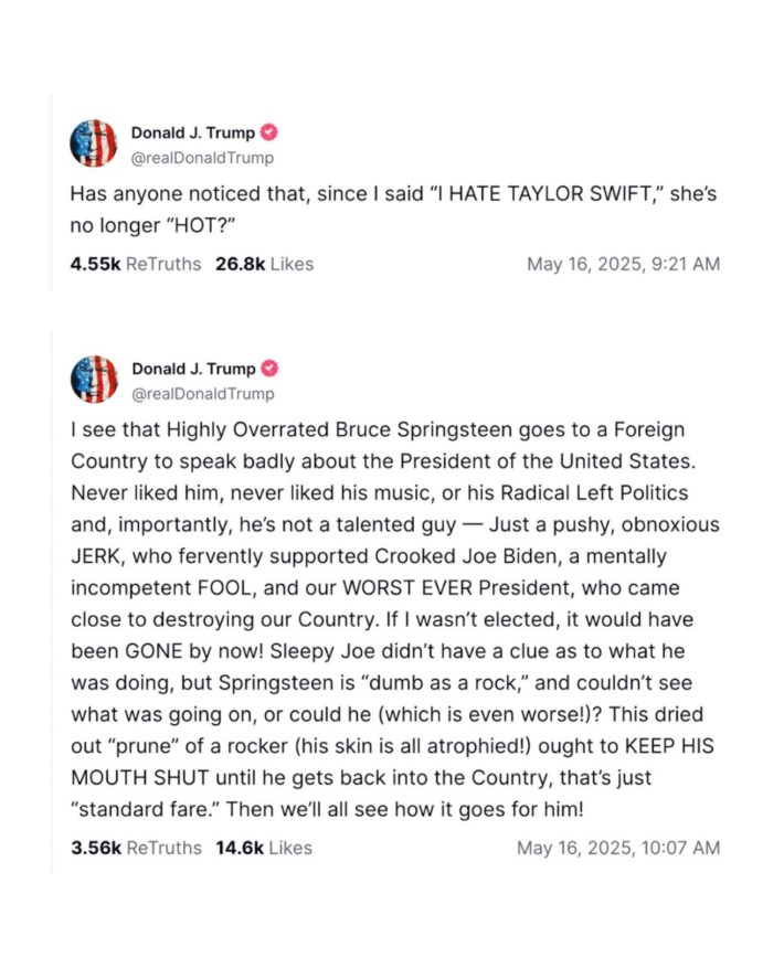 Donald Trump, the president of the United States, is currently in the United Arab Emirates, the last stop on his current trip to the Middle East. While over there, he is going online to attack American pop stars Taylor Swift and Bruce Springsteen, both of whom have criticized him and endorsed Democrats in the past. In two posts on his Truth Social site, published less than an hour apart, Trump writes that Swift is "no longer 'HOT'" and that Springsteen is a "Highly Overrated... dried out 'prune' of a rocker." He also makes what could be interpreted as a cryptic threat toward Springsteen.