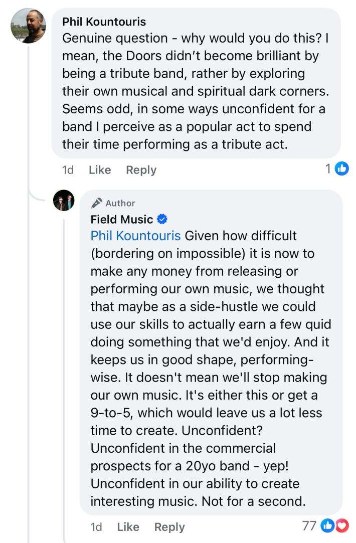 Responding to a Facebook commenter asking why they would start a Doors tribute band, Field Music answered, "Given how difficult (bordering on impossible) it is now to make any money from releasing or performing our own music, we thought that maybe as a side-hustle we could use our skills to actually earn a few quid doing something that we'd enjoy. And it keeps us in good shape, performing-wise. It doesn't mean we'll stop making our own music. It's either this or get a 9-to-5, which would leave us a lot less time to create. Unconfident? Unconfident in the commercial prospects for a 20yo band - yep! Unconfident in our ability to create interesting music. Not for a second."