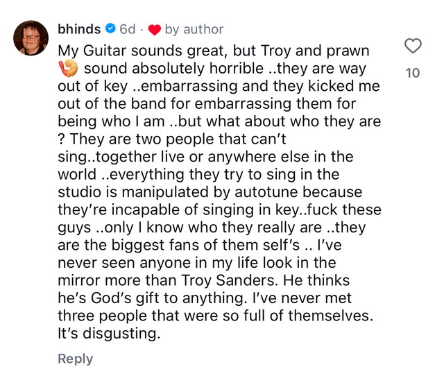 My Guitar sounds great, but Troy and prawn sound absolutely horrible ..they are way out of key ..embarrassing and they kicked me out of the band for embarrassing them for being who I am ..but what about who they are ? They are two people that can’t sing..together live or anywhere else in the world ..everything they try to sing in the studio is manipulated by autotune because they’re incapable of singing in key..fuck these guys ..only I know who they really are ..they are the biggest fans of them self’s .. I’ve never seen anyone in my life look in the mirror more than Troy Sanders. He thinks he’s God’s gift to anything. I’ve never met three people that were so full of themselves. It’s disgusting.
