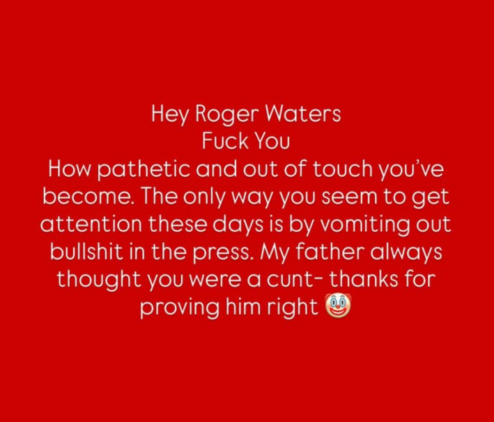 Osbourne's son responded to these convoluted remarks in an Instagram story and post: “Hey [Roger Waters],” he wrote. “Fuck you. How pathetic and out of touch you’ve become. The only way you seem to get attention these days is by vomiting out bullshit in the press. My father always thought you were a cunt – thanks for proving him right.” He then added the hashtag “fuckkrogerwaters.”