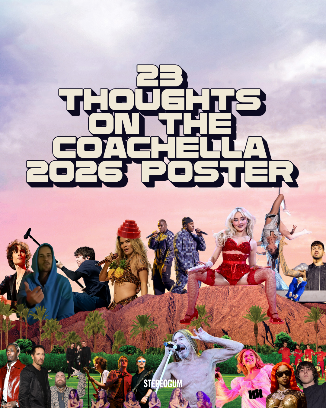 I can't stop writing about the font sizes. I started doing it god knows how many years ago, and I will continue to do it until someone discovers my corpse hunched over my laptop, with 148 open tabs because I'm trying to figure out what the deal is with some Belarusian dirtstep DJ. The Coachella poster is not an organic document. It's the product of what must be tense and tedious negotiations among bookers, talent agents, managers, weed rollers, and the short guy who poses for pictures with Conner4Real so that he'll look taller. But when you take in the totality of the poster -- the famous names, the big returns, the surging newcomers, the lower-card names that look like random jumbles of letters and numerals -- narratives emerge. This annual Stereogum column is my attempt to figure out those patterns, to divine some order from the screaming bedlam. Wish me luck.