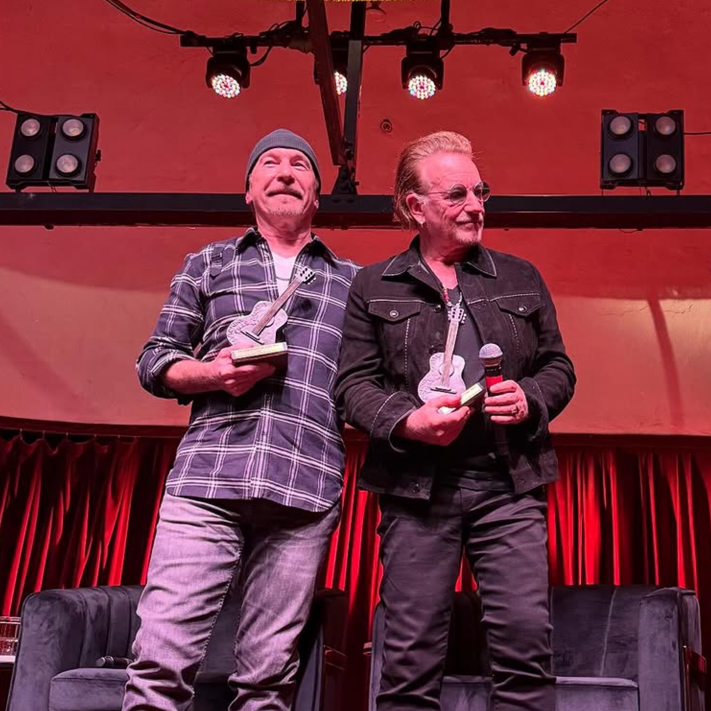 Every year, Oklahoma's Woody Guthrie Center honors a different artist for contributions to activism through music with the Woody Guthrie Prize. Bruce Springsteen, Mavis Staples, Joan Baez, and John Mellencamp all have Woody Guthrie Prizes. Tom Morello got it last year, and Pussy Riot got it two years ago. This year's Woody Guthrie Prize recipient is U2, a band that has long made a point out of commitment to justice, though their recent efforts in that arena have been a bit sad. On Tuesday night, U2's Bono and the Edge, representing the rest of the band, came to Cain's Ballroom in Tulsa to accept the prize and to play a special set.