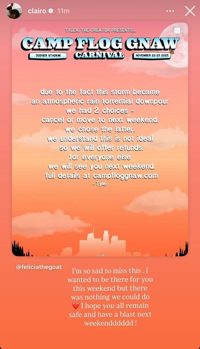 Pushing back your entire music festival by a week is a radical maneuver, but it's one the organizers of Tyler, The Creator's Camp Flog Gnaw Carnival believed they had to take. The fest was all set to pop off this Saturday and Sunday at Dodger Stadium in Los Angeles, but due to extreme inclement weather in the forecast, it's been rescheduled for the following weekend and will now take place on Nov. 22 and 23. Tyler's Instagram account posted the following message today:
