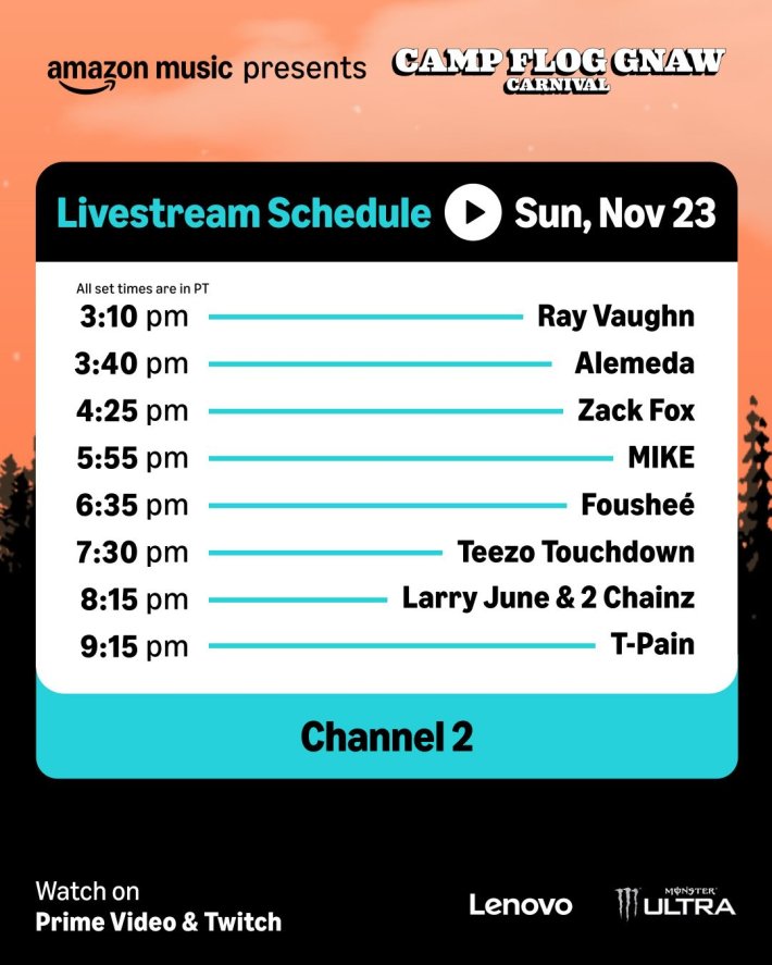 This year's Camp Flog Gnaw was originally planned for last weekend at LA's Dodger Stadium, but extreme weather in the forecast prompted Tyler, The Creator to push the festival back a week. Unfortunately, this resulted in some artists like Clairo dropping from the event, but Kali Uchis, Blood Orange, Geese, Fakemink were all added. The stacked two-day lineup's also got A$AP Rocky, Childish Gambino, Earl Sweatshirt, Clipse, Doechii, Thundercat, and more. The livestream begins across two channels each day at 6PM ET at Amazon Music's Twitch (on mobile it may prompt you to use the Twitch app) and Prime Video. Check out the schedules for both days below.
