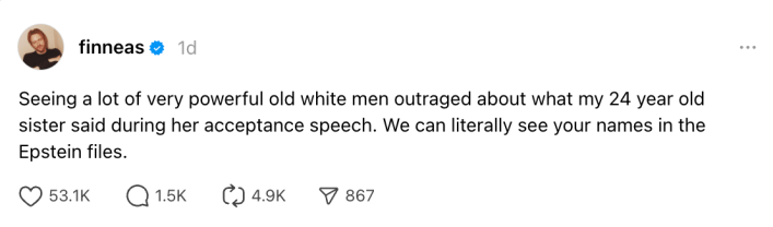 “Seeing a lot of very powerful old white men outraged about what my 24 year old sister said during her acceptance speech,” Finneas posted on Threads. “We can literally see your names in the Epstein files.”