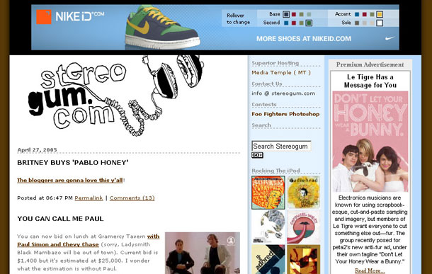 With the exception of some dysfunctional bells and whistles, Stereogum's format hasn't changed that much from the personal blog I created in January 2002 as a way to share stupid Britney Spears photos and Avalanches MP3s. Everything's different now. ('Til Tuesday reference -- great start, Scott.)