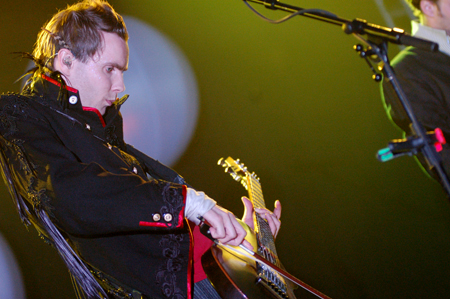 In response to the post-Outback and T-Mobile ad campaign flak, Kevin Barnes wrote us an essay in which he said "Selling Out Isn't Possible." What he didn't say was where all that money was going: Roseland Ballroom, costumes, and Kevin singing "St. Exquisite's Confessions" while sitting on and stroking a live white horse. This show was the crown jewel in what was a high-concept fall tour, even by oM standards: pulling primarily from Skeletal Lamping (a jagged and fractured pile of brilliant, barely stitched together song seeds that's itself a fuck-you to sell-out claims) and Hissing Fauna..., Kev and a cadre of costumed actors created a full and distinct set piece around each stop on the setlist. The sketches were associated to songs' lyrical themes: There was a military scene; a crazy beach party; Kevin as centaur getting the shaft from two damsels who preferred his brother as fife-playing satyr (this related to "Beware Our Nubile Miscreants" -- "you only like him 'cause he's sexually appealing," etc.), which devolved into an orgy scene, the damsels and the fife player erotically eating fruit and squirting juices on themselves and writhing under red lights. Demons coaxed Kevin to commit suicide via pills, and injections, and then by hanging from a noose (feet off the ground, hanging ... scary). The main set's big finish: Kevin emerging from a coffin, covered in only shaving cream. The full show's big finish: a cover of "Smells Like Teen Spirit." Only Nirvana did it better. But then, Nirvana never did it with a horse.