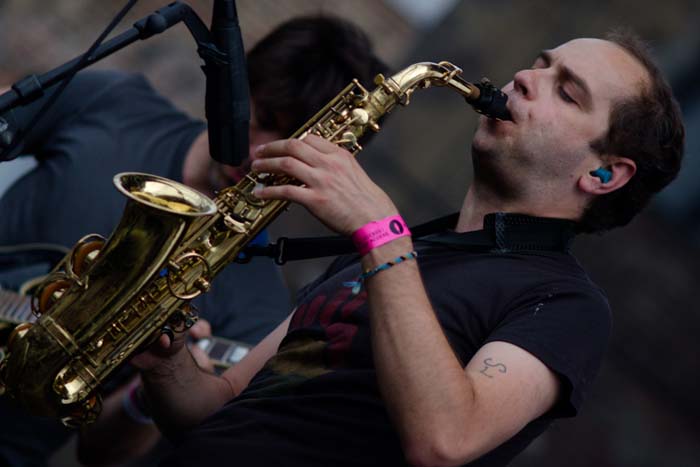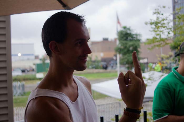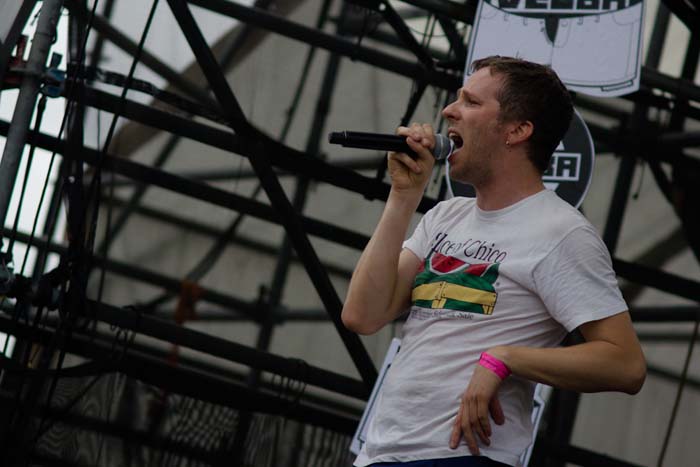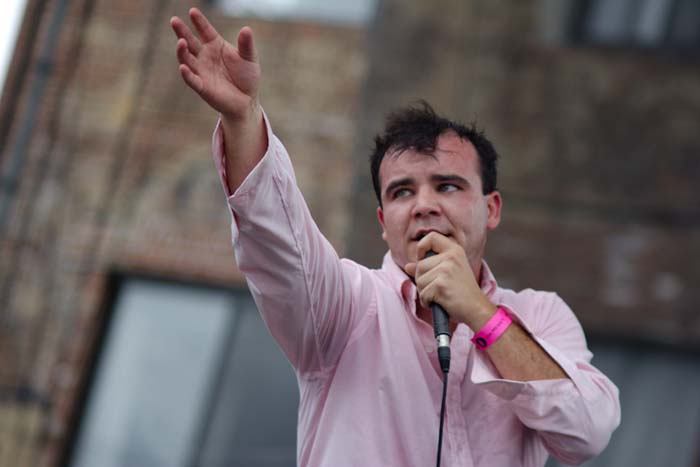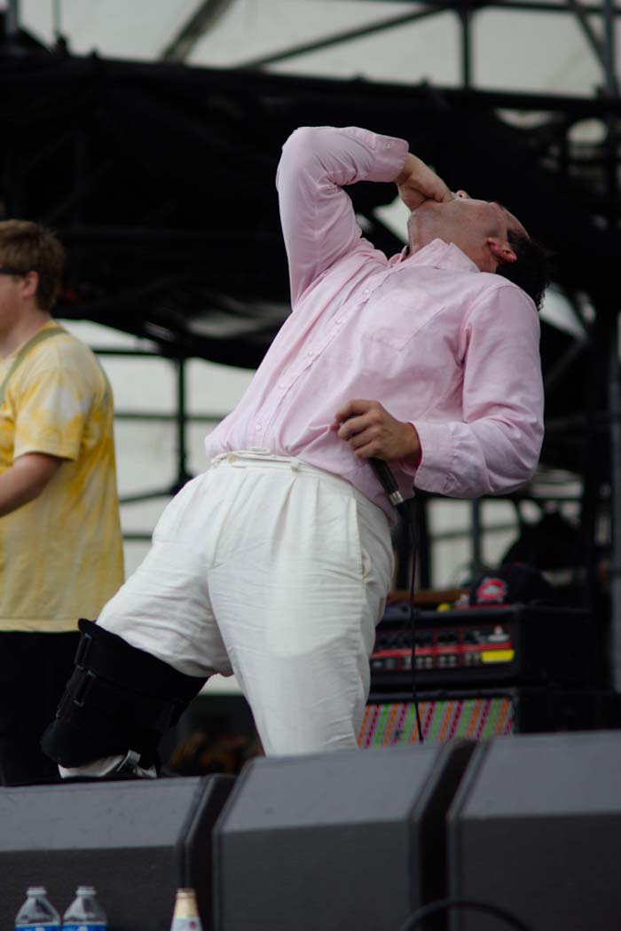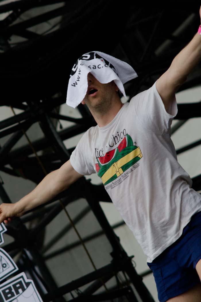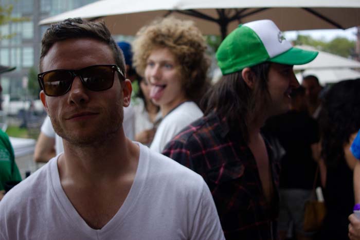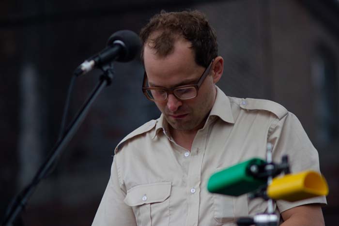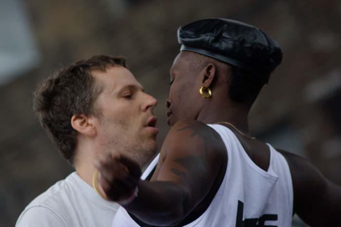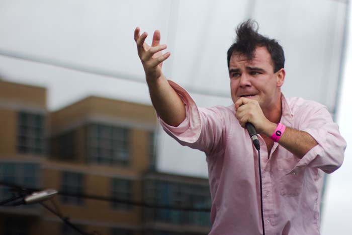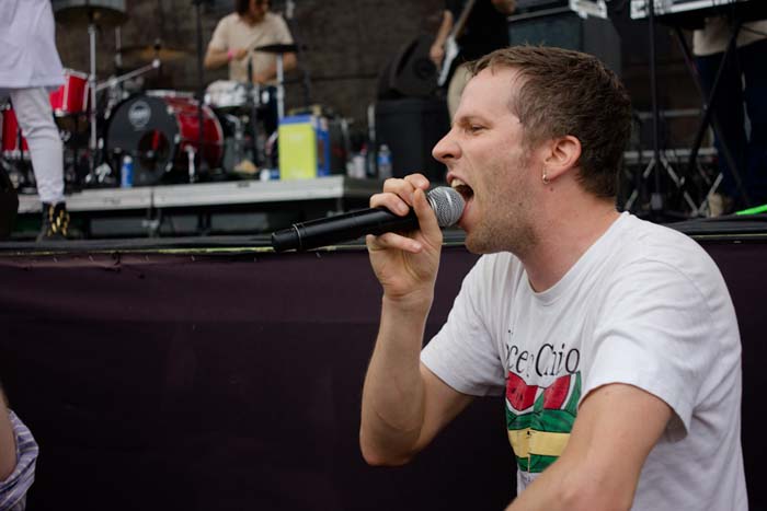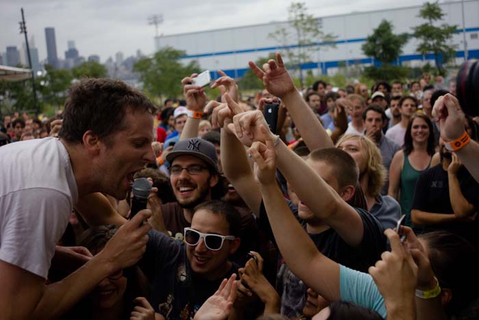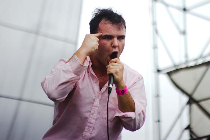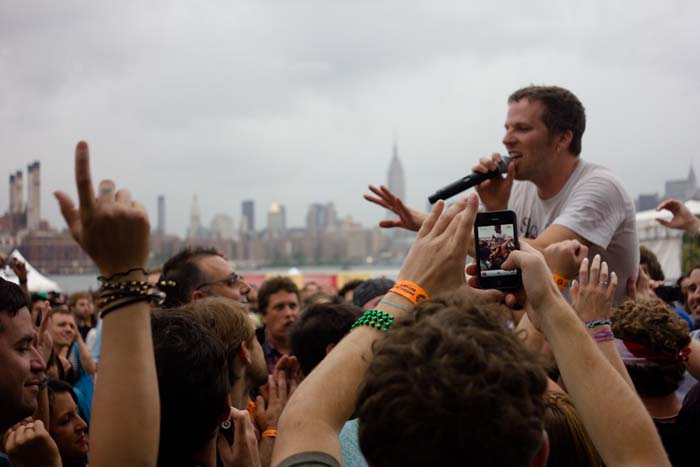 Strange weather, wasn't it for !!!'s free show down at the Williamsburg Waterfront on Sunday. Photographer Chris Person braved the ominous skies, intermittent rain, and the free rum lines at the VIP section at the adjacent All Saints Pub for this set of shots from the day.